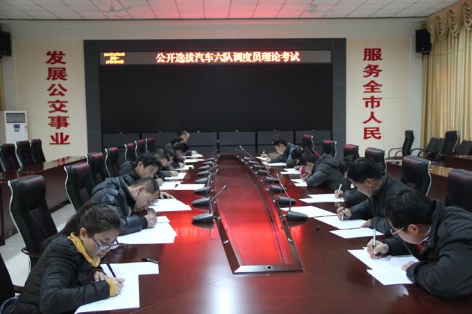 2013年12月底,市公交公司汽車六隊3名調度員公開選拔理論考試在公司一樓會議室開考,符合申報條件的15名員工,在規定時間內按照給定的5個題目,圍繞調度職責、如何做好運營調度工作等相關內容進行了認真答卷。本著公開、公正的原則,由公司領導班子、人事科長、所在車隊負責人組成的評委對密封試卷現場評分后,對理論成績排名前6名的同志當場進行了民主評議。最后,張東衛、張光輝、潘志紅3名同志理論成績、民主評議綜合得分排名居前三位。經過3天公示無異議后,3名同志已于2014年1月3日到崗培訓。