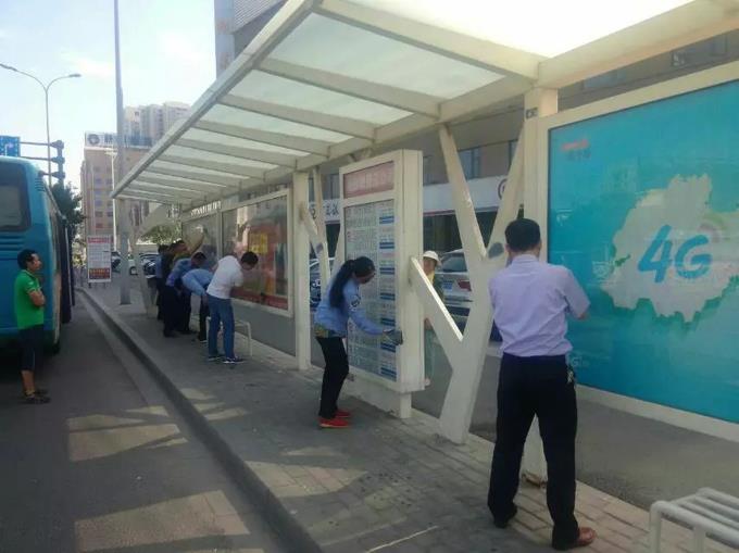 公交候車亭上面粘有透明膠、不干膠、漿糊等,有的候車亭燈箱還被糊上了好幾層廣告,黨員們手拿小鏟子、小刷子、清潔球、水桶等清除工具,三人一組、兩人一伙,有的噴水,有的用鏟刀用力清除,一個個干的熱火朝天。經過三個多小時的清理,西四路兩側公交候車亭衛生死角和野廣告被清理干凈,市民的候車環境衛生得到很大改觀。在候車亭等車的市民們高興地說:“站牌上到處都是小廣告,各種顏色的,像牛皮癬一樣討厭,這些黨員真能干,小廣告沒有了,在候車亭等車心情也舒暢了。”