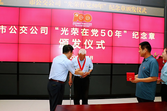 6月24日上午,在中國共產黨成立100周年即將到來之際,東營公交組織開展了“光榮在黨50年”紀念章頒發儀式。公司黨委書記趙龍、經理劉海、副經理孫紅光、景洪培和黨齡50周年老黨員以及黨員代表等參加了頒發活動。