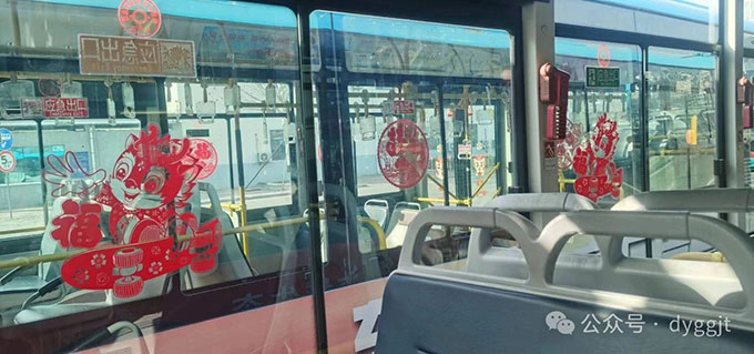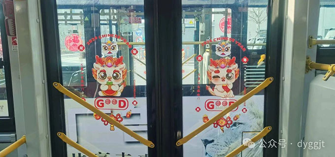 近日,為營造更加濃厚的龍年新春氛圍,給市民更好的乘車體驗,東營市公交集團在部分公交車車廂掛上了一連串的龍年拉花,還貼上了喜慶的窗花、“龍”形狀的貼畫……打造“溫馨車廂”,讓乘客一進車廂,就感受到濃厚的春節(jié)氛圍。