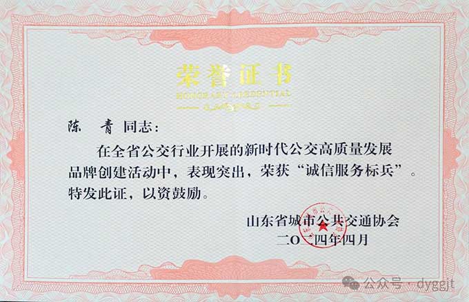陳青同志現(xiàn)為市公交集團(tuán)汽車五隊(duì)5路公交車駕駛員,該同志始終牢記“以乘客為中心”發(fā)展理念,認(rèn)真貫徹落實(shí)“用心服務(wù),待乘客如親人”服務(wù)理念,兢兢業(yè)業(yè)地奮戰(zhàn)在5路線上近10余個(gè)春夏秋冬,2024年被評(píng)為山東省公交行業(yè)誠(chéng)信服務(wù)標(biāo)兵。